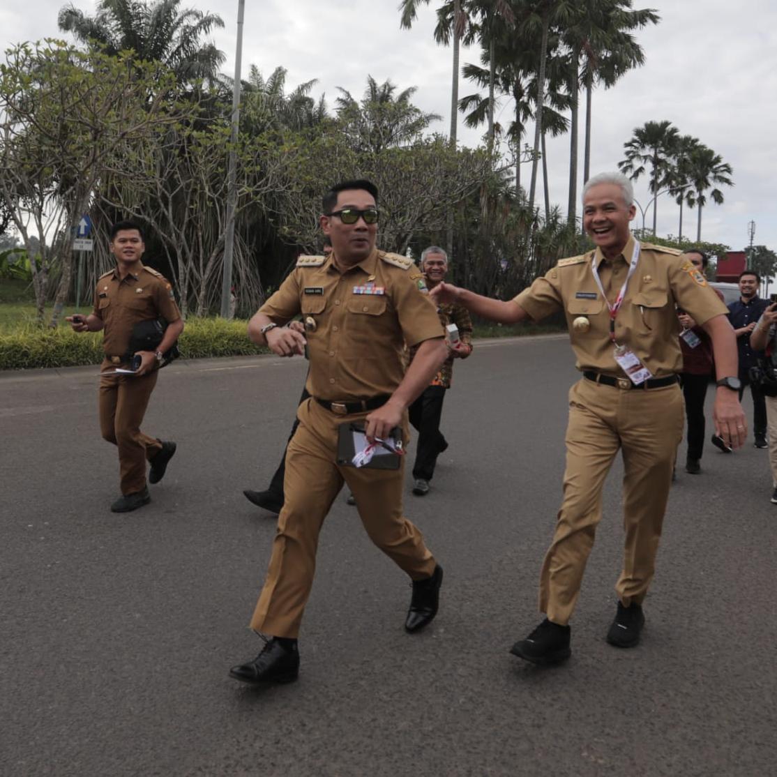 Dari raut mukanya, Ridwan Kamil tampak semangat saat berlari. Di tengah berlari kecil itu, Ridwan Kamil sempat memperlambat larinya dan menyapa lalu menyalip Gubernur Jawa Tengah Ganjar Pranowo yang juga sedang terburu- buru menuju ke tempat acara.